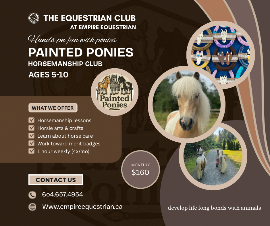 No horse experience is required! Each week we will work on exciting new topics, working toward merit badges so that our painted pony club members have goals to work towards and mementos to take home and cherish!