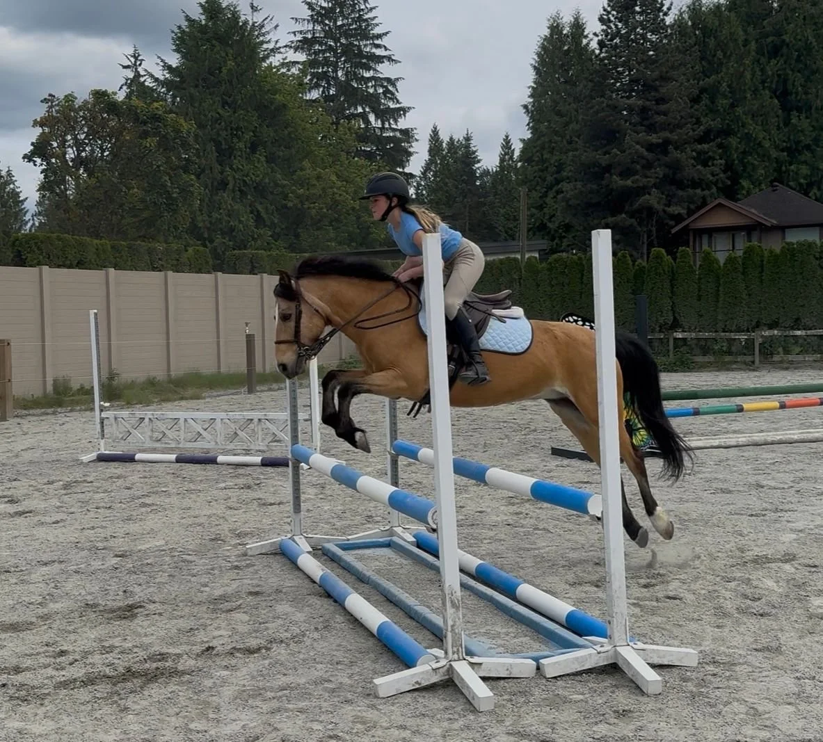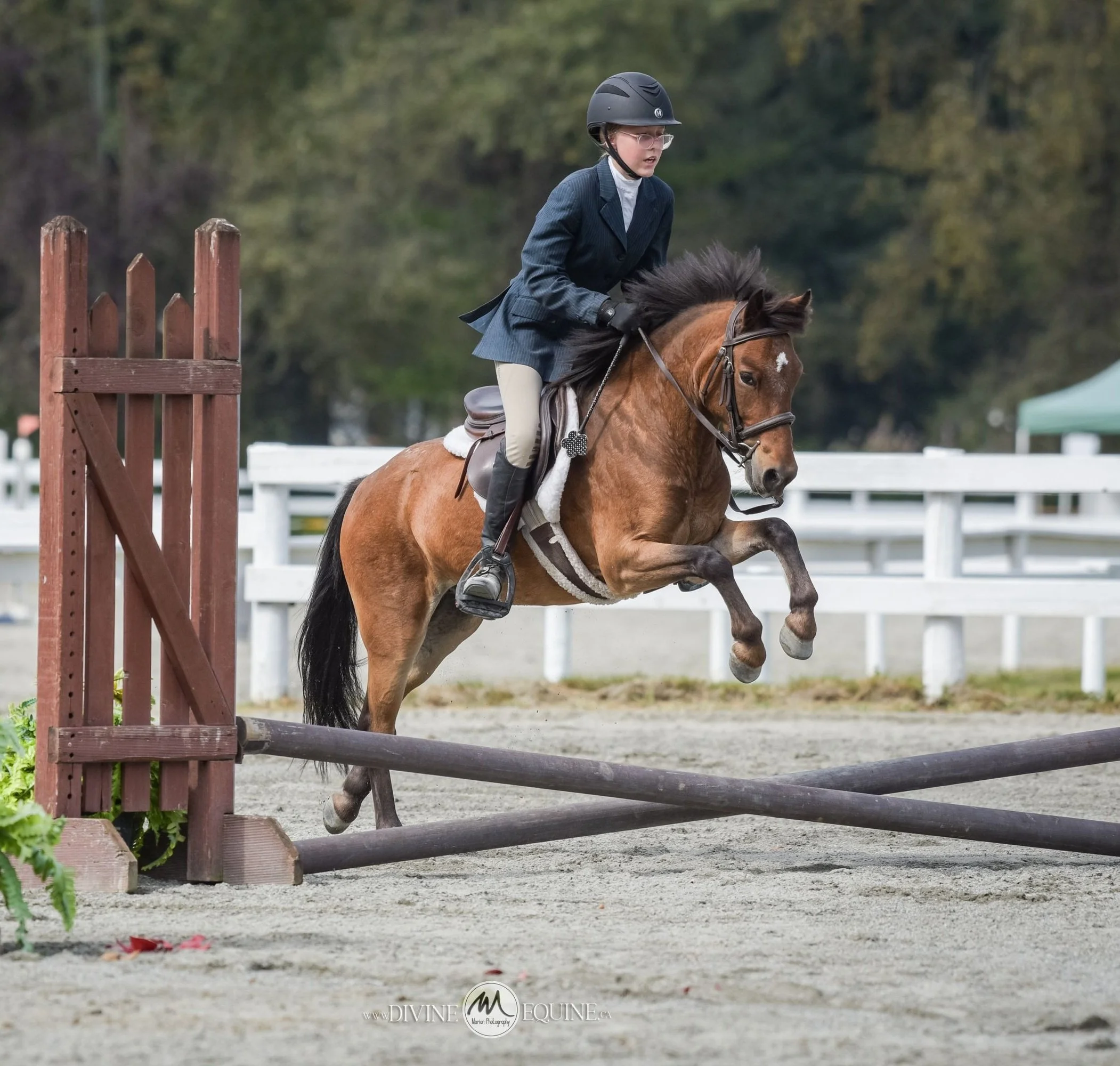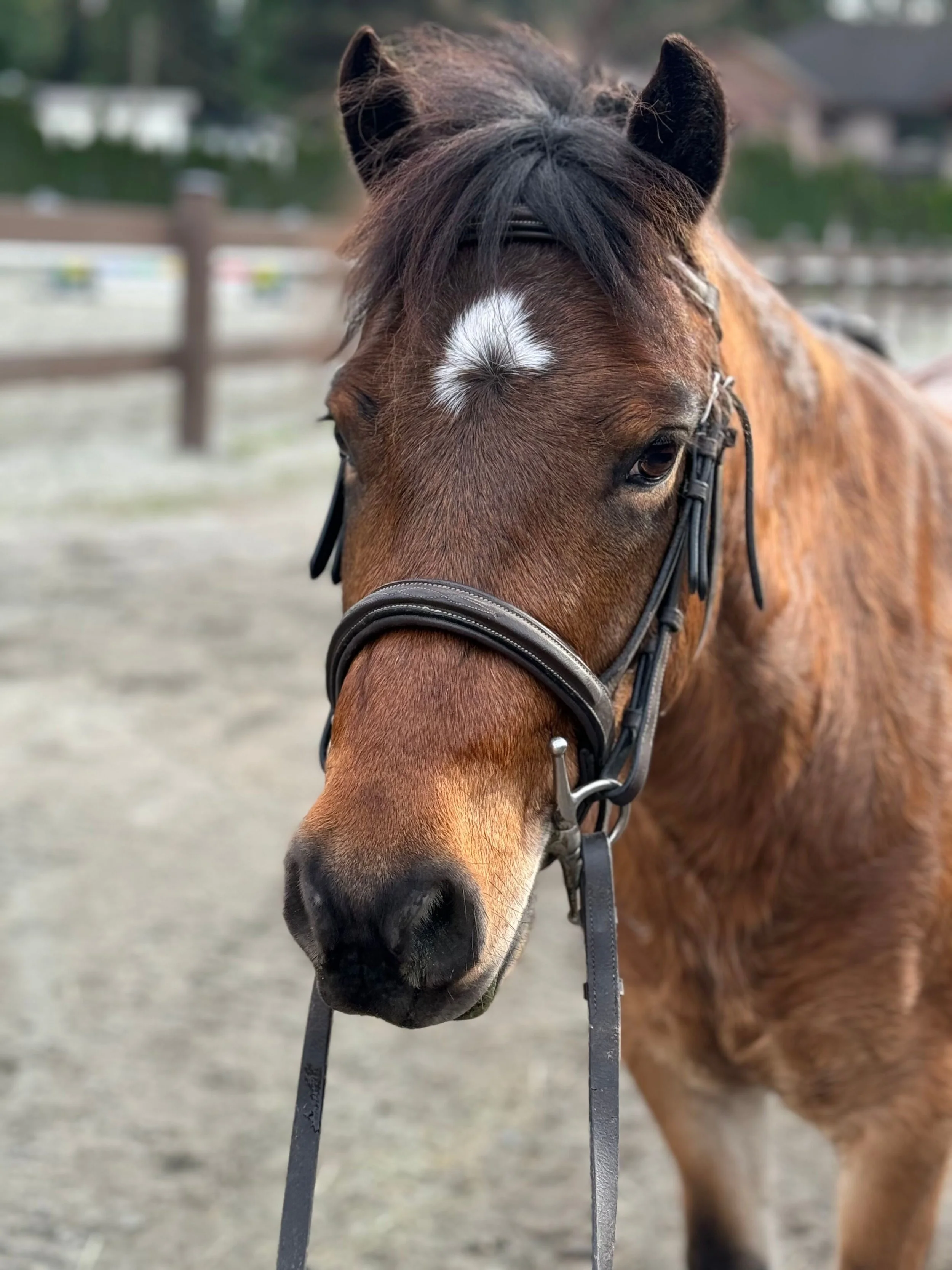 Paddington is one of our small ponies ridden in our lesson programs. He comes from Northern BC, and has experience in the hunter, jumper and cross country rings. He loves to jump, and is brave and confident jumping over all of our challenging jump obstacles. He jumps in stellar form and loves to work. He is also wonderful on the trails. He enjoys being part of our stable lessons, and like most of our ponies, always loves a good treat!