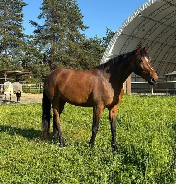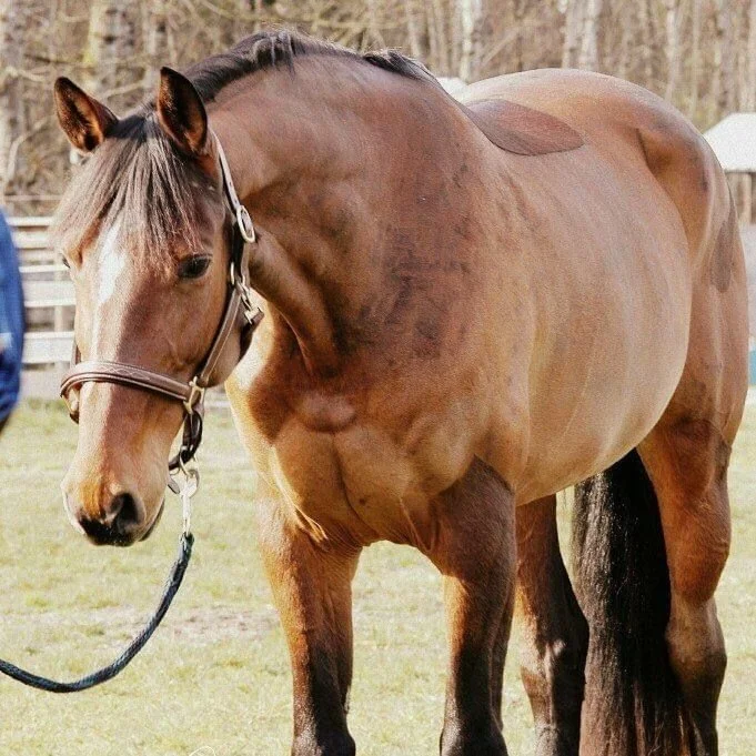 Scout is a personable happy go lucky gelding that has been an excellent addition to our program. He has a background in dressage, as well as jumping. He has smooth gaits, which make him a great horse to learn on. Our teen and adult riders enjoy lessoning on Scout and learning how to connect a horse from the leg to the hand. He has so much character and deeply connects with his handlers! He loves a good scratch and is always up for treats of all kinds!