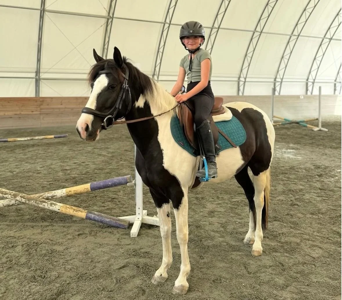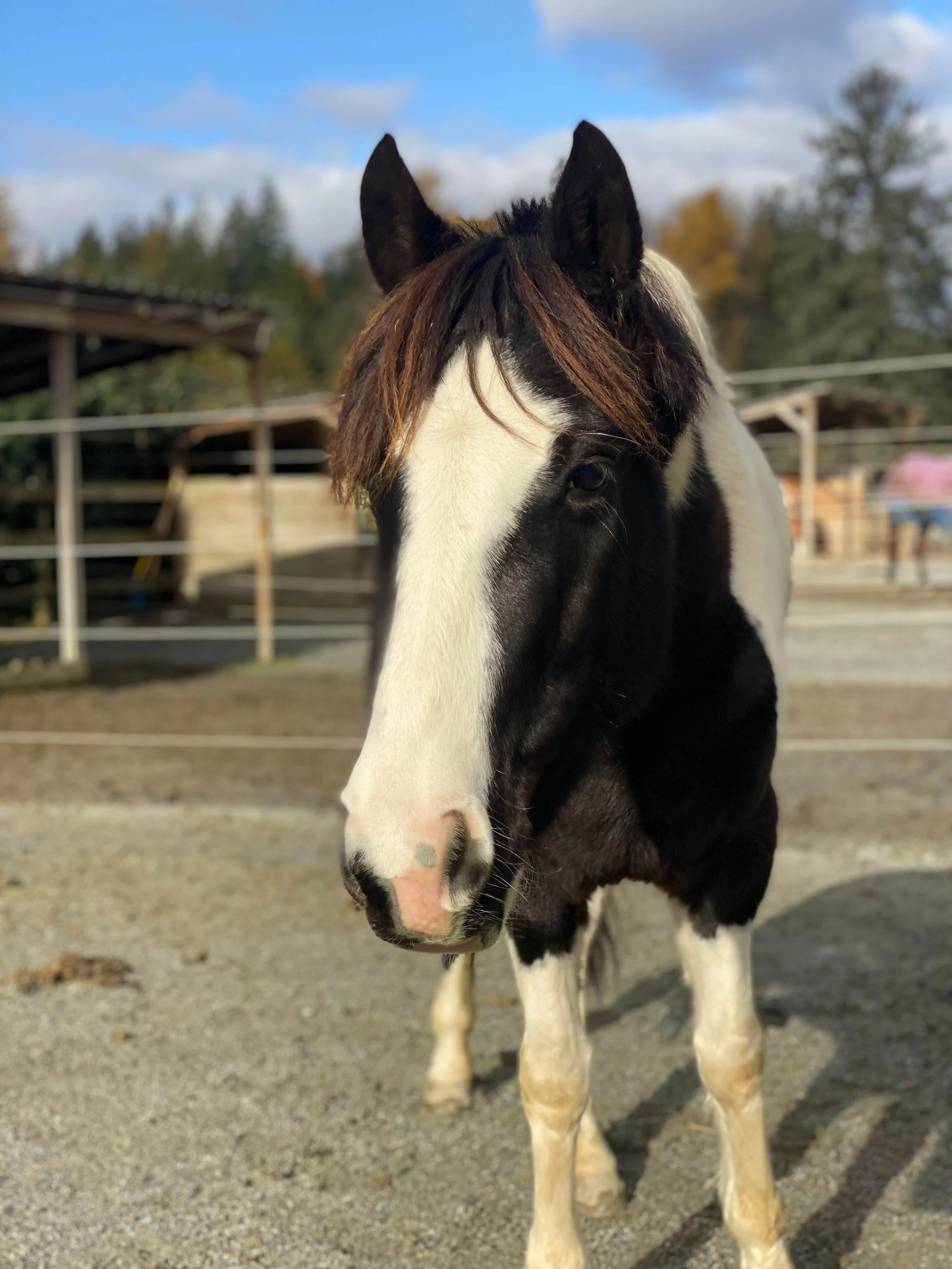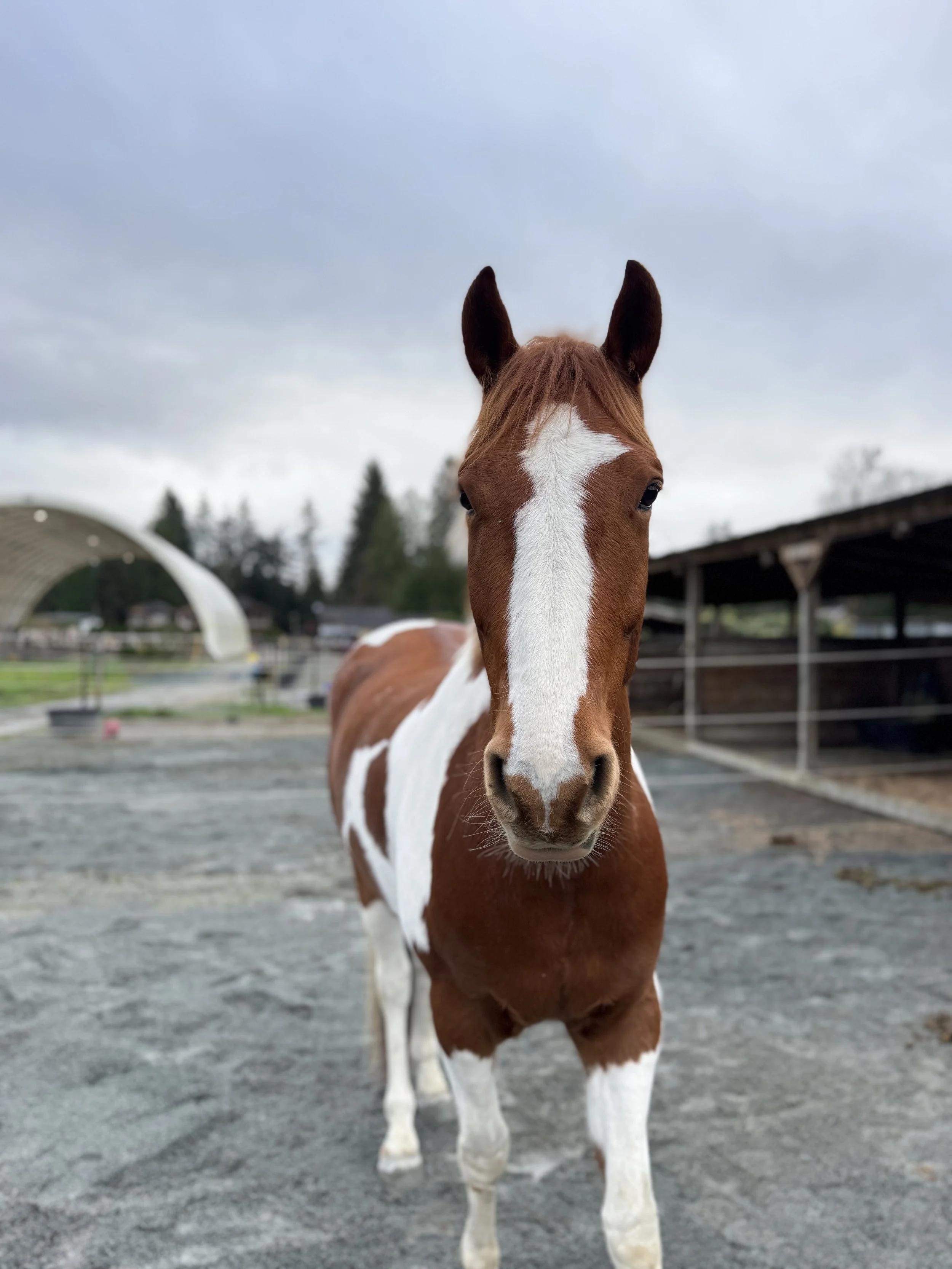 Hemi is one of our many painted superheroes! From learning to canter, to jumping first jumps, Hemi has been a barn favourite for many years. He is very uniquely marked and has one brown eye and a stunning blue eye! Hemi enjoys leisure trail rides and time grazing in the field. He is a lover of all treats and enjoys heading out on new adventures!