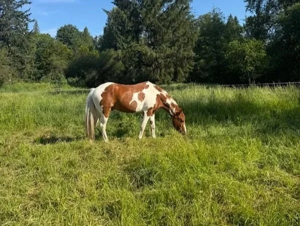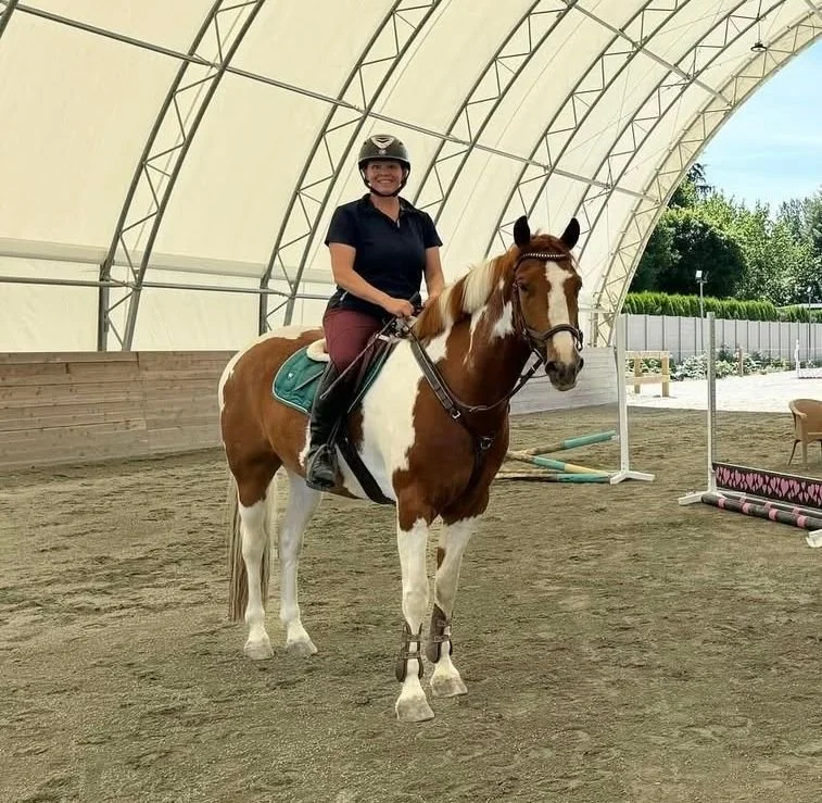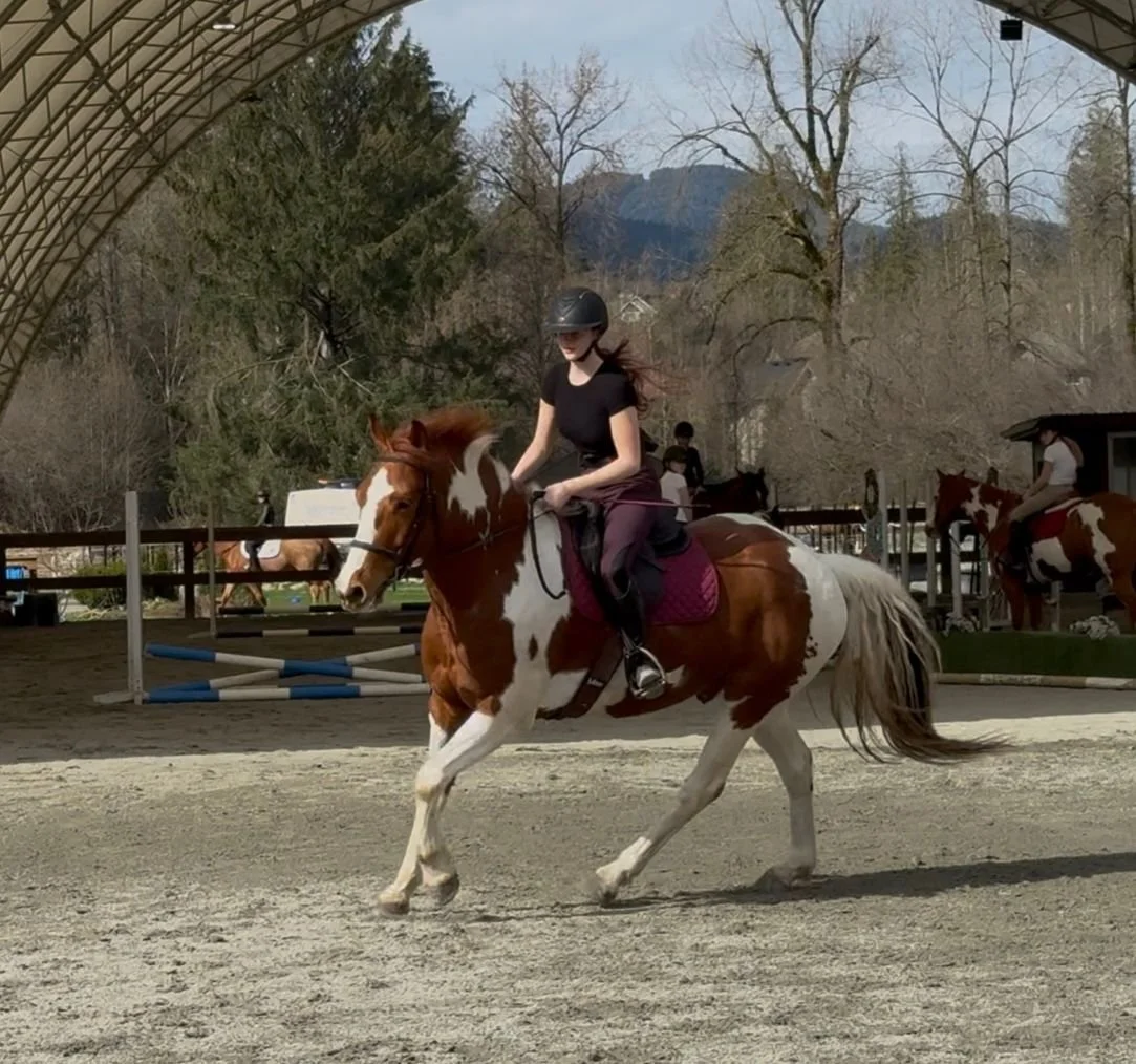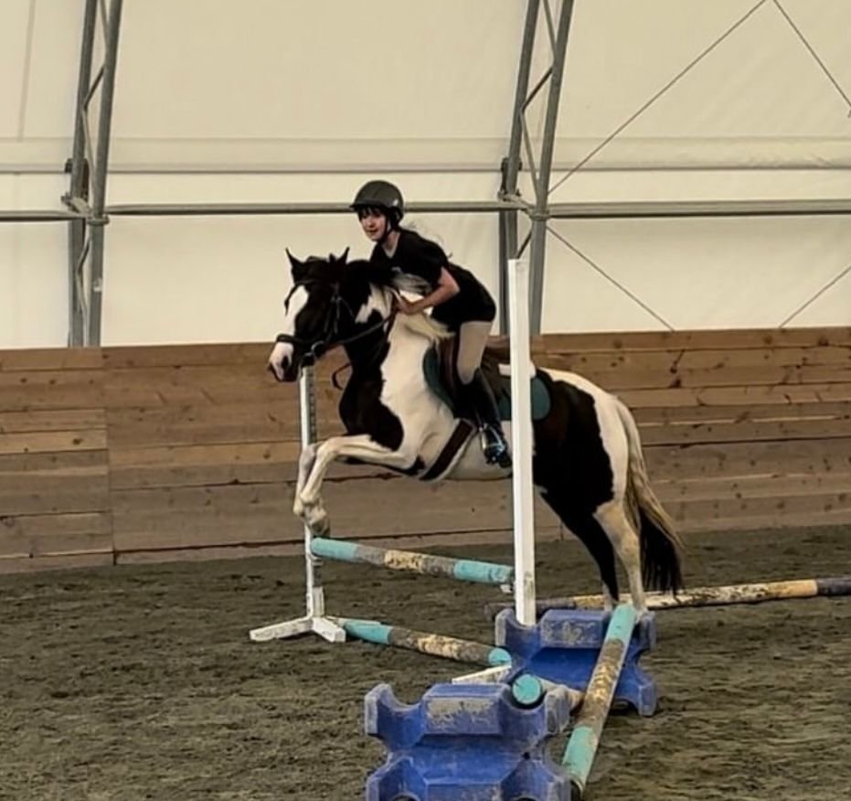 Hemi is one of our many painted superheroes! From learning to canter, to jumping first jumps, Hemi has been a barn favourite for many years. He is very uniquely marked and has one brown eye and a stunning blue eye! Hemi enjoys leisure trail rides and time grazing in the field. He is a lover of all treats and enjoys heading out on new adventures!