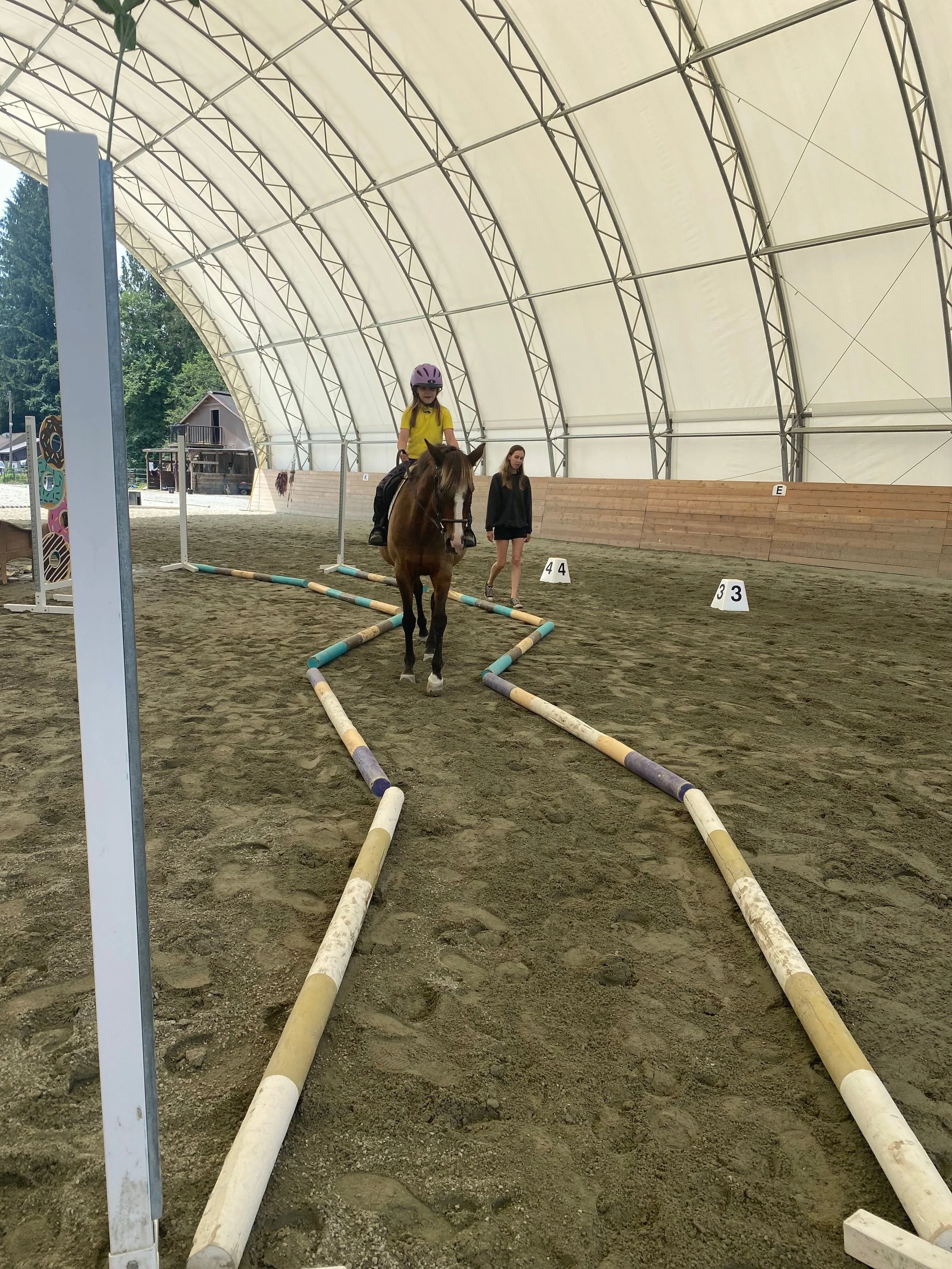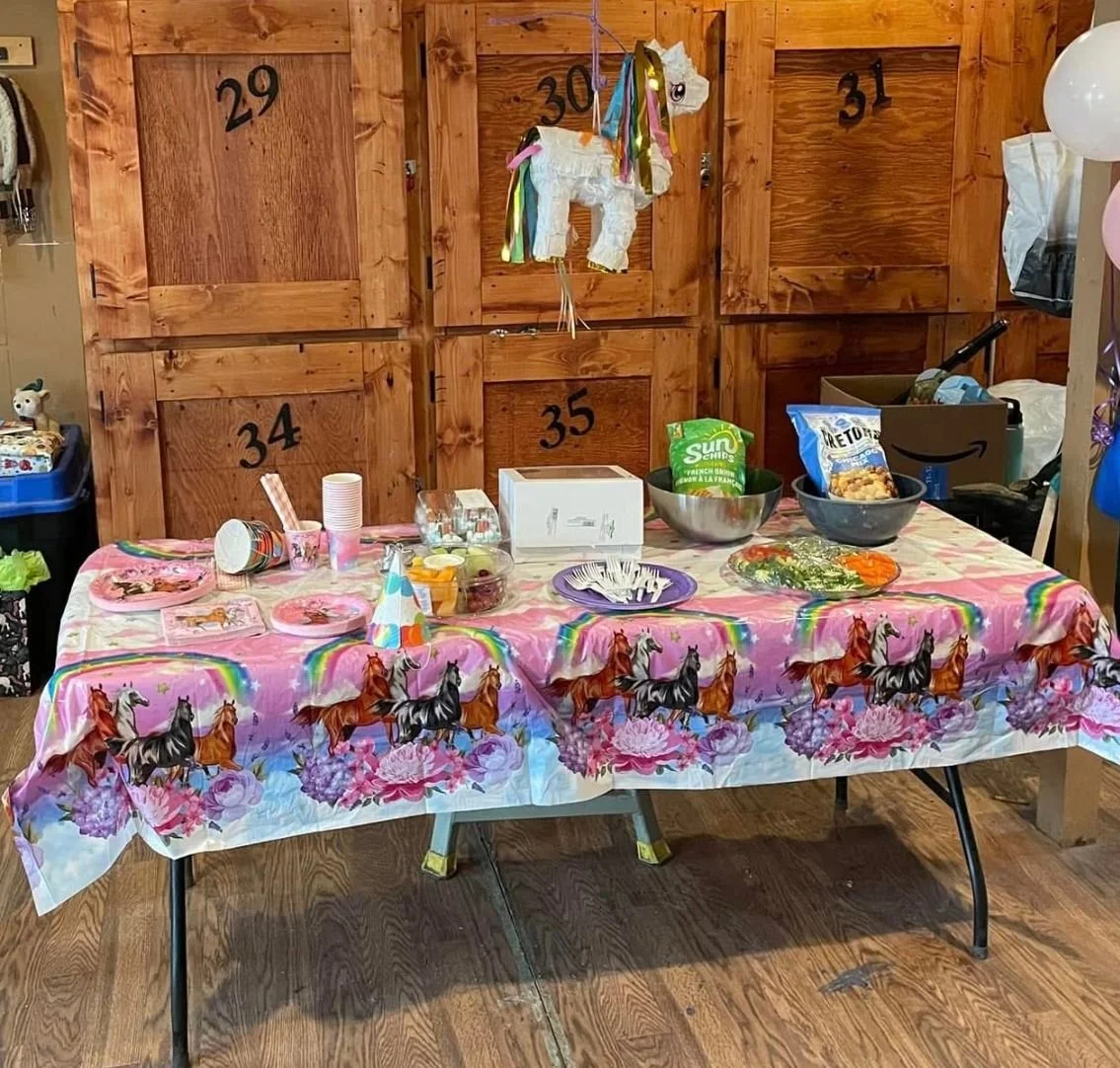 Our pony birthday parties include 1 hour of engaging pony ride lessons led by experienced instructors, photo ops, a fun horseshoe painting craft to take home, and use of our cozy clubroom for the second hour for your cake, presents, and party fun.